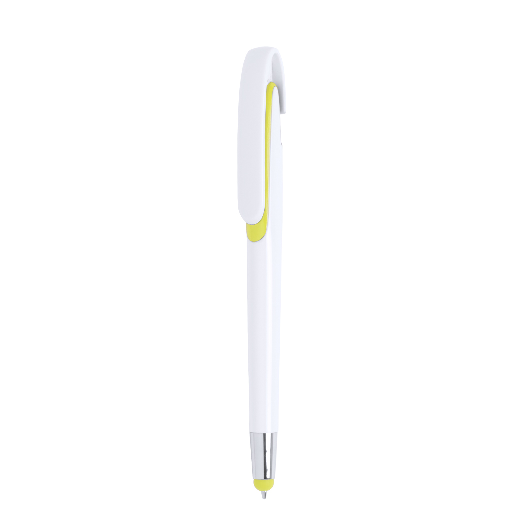 Bolígrafo puntero de mecanismo pulsador con cuerpo de acabado brillante en color blanco y accesorios en variada gama de vivos colores. Con clip maxi y tinta azul.