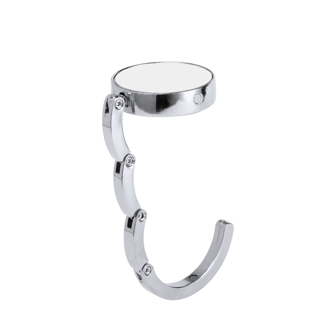 Cuelgabolsos metálico plegable con corona en polipiel de vivos colores. Presentado en estuche individual con interior troquelado.