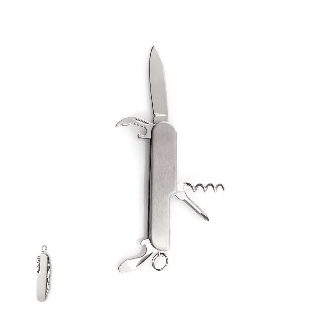Navaja multiusos de acero inox de 6 funciones. Incluye navaja, abridores, destornillador y anilla para llavero. Presentada en caja individual.