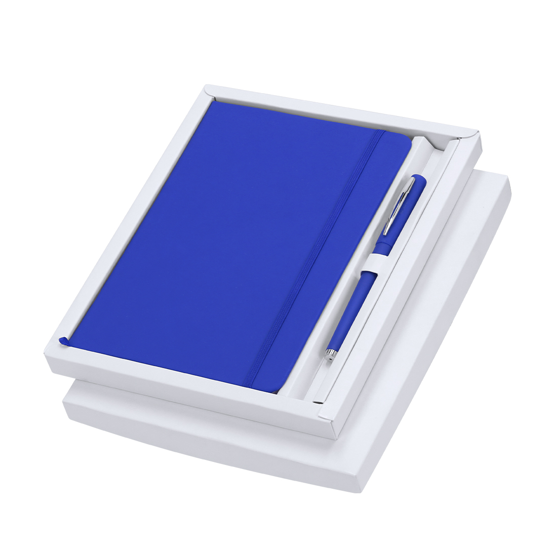 Set de bloc de notas con tapas de suave tacto acabadas en polipiel y bolígrafo de suave cuerpo a juego. De 100 hojas lisas con elástico de sujeción y marcapáginas de tela a juego. Presentado en elegante estuche de cartón blanco troquelado. Bolígrafo en tinta azul.