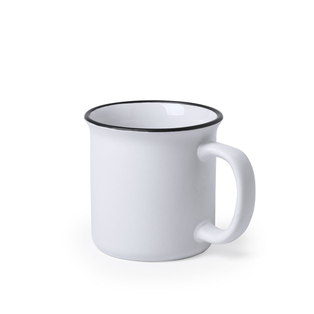 Taza de cerámica de 300ml de capacidad con diseño vintage. En sobrio diseño bicolor, con anilla en el borde. Presentada en caja individual.Disponible manual de instrucciones en español e inglés.